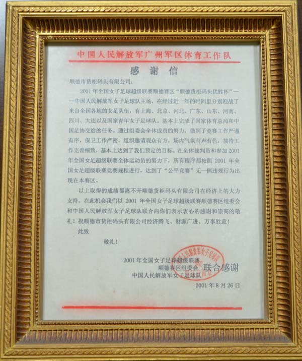2001-1女足超级联赛、顺德讲区组委会、解放宫女子足球队联合感谢信
