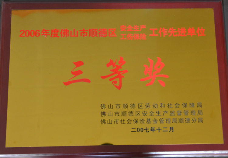 2006年度佛山市顺德区安全生产工伤保险工作先进单位三等奖