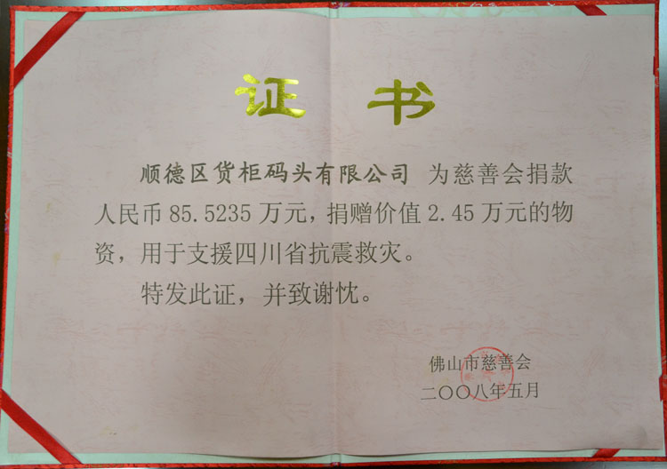 2008-5捐款85.5235万元佛山市慈善会证书