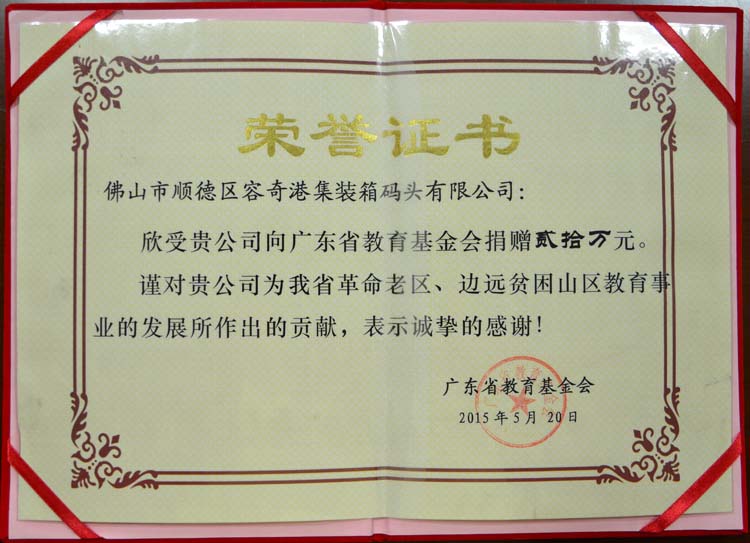 2015-5广东省教育基金会捐赠20万荣誉证书