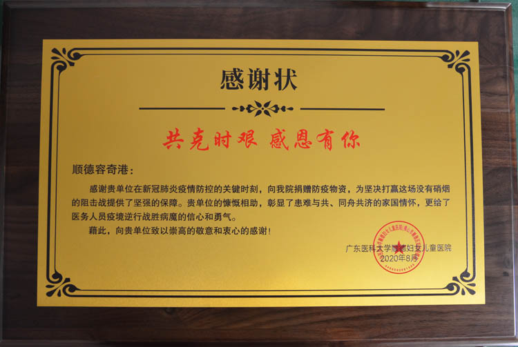 2020-8广东医科大家顺德妇女儿童医院新冠肺炎防控感谢状
