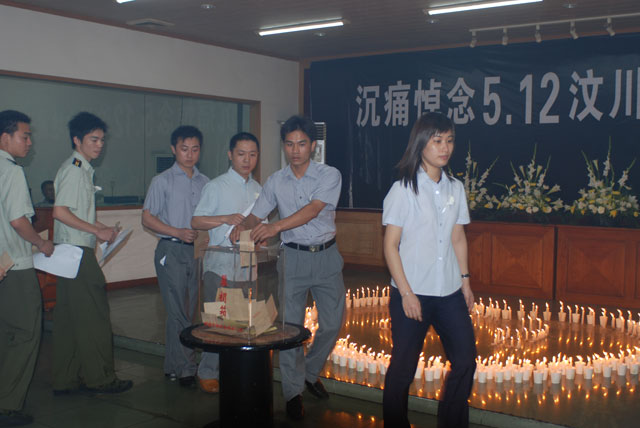 会场布置肃穆庄严,主席台地面上有一个用烛光围成的“5.12”心形图案。大家手捧蜡烛,为遇难同胞默哀三分钟后,一起朗诵了诗歌《生死不离》,人们神情凝重,现场气氛沉重。部门经理们逐一讲述了自己对5.12汶川大地震的感言。接着,党员们交纳“特殊党费”、团员们交纳“特殊团费”。最后,大家一起齐唱《团结就是力量》和《国歌》。