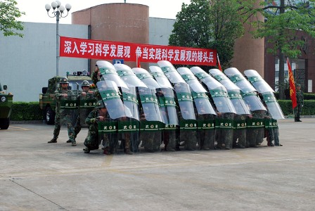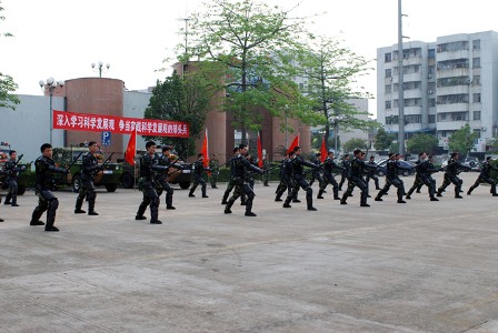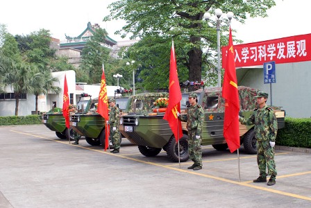 4月27日下午,公司民兵营派出应急分队三十多名民兵、三台水陆两用吉普车和三台军用卡车,参加了顺德区民兵预备役实践科学发展观军事训练汇报表演。