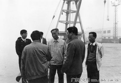 四月上旬,广东省委书记林若在广东对外经济活动最为发达的地区之一的顺德县、南海县、高明县和佛山市进行调查研究。图是林若同志(中)在顺德县容奇港考察时与港口干部交谈。