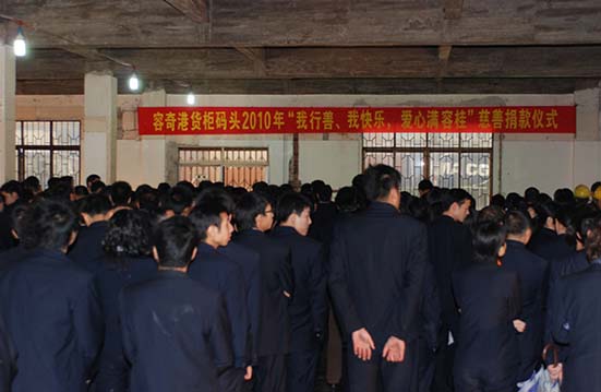 1月22日下午3时,尽管外面的天气阴雨绵绵、冷风飕飕,但容奇港货柜码头内人潮涌涌、情意浓浓,公司全体员工正在踊跃参与容桂街道2010 年“我行善、我快乐,爱心满容桂” 慈善捐款仪式。