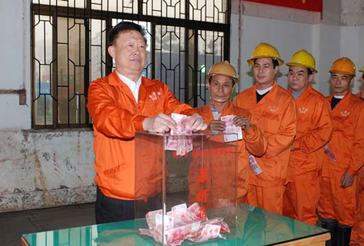 1月20日上午,公司副经理以上管理人员会议刚结束,就接到了《容桂慈善会2010年募捐工作方案的通知》。于是,总经理室又马上召集各部门经理回到会议室,布置募捐工作,要求各部门大力发动、全面落实,务必做到全员参与,在公司再掀献爱心热潮。