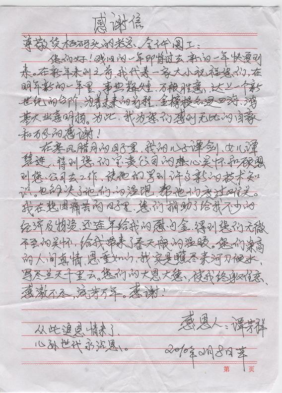 2010年2月10日谭念烈士父亲致公司感谢信