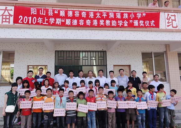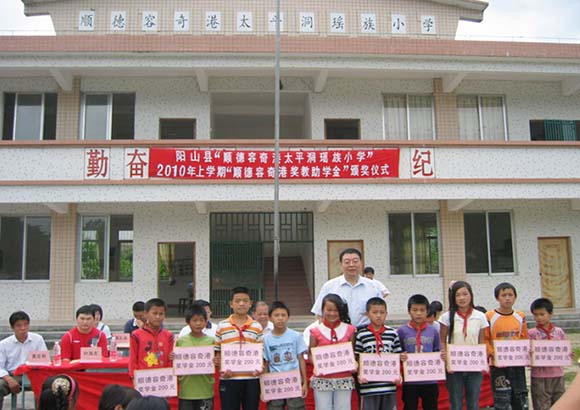 7月9日、10日,公司朱总一行7人与省教育基金会余秘书长等人一同前往清远阳山县“顺德容奇港太平洞瑶族小学”、“杨梅顺德容奇港小学”,代表公司全体员工向这两所学校的师生颁发2010年第一学期“顺德容奇港奖教助学金”。