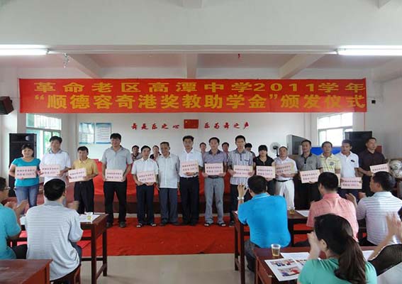 为庆祝建党九十周年, 6月23-24日及6月28-29日,公司选派两批先进共青团员和共产党员等40人,分赴惠州高潭、河源龙川及清远阳山,向受公司资助的惠东县高潭镇“高潭中学”、 龙川县“上扬顺德容奇港小学”及 清远阳山县“顺德容奇港太平洞瑶族小学”和“杨梅顺德容奇港小学”颁发2011年“顺德容奇港奖教助学金”。