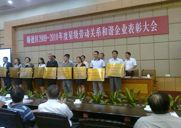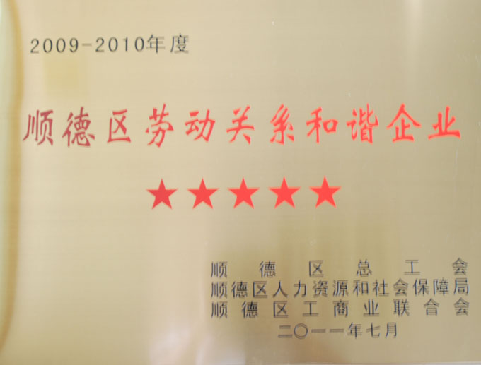 2011年9月29日上午,我司获颁“2009-2010年度顺德区五星级劳动关系和谐企业”牌匾,劳动关系管理工作受到肯定。