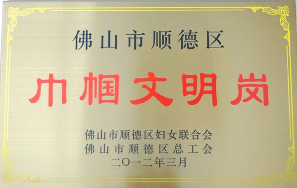 在2012年3月5日召开的顺德区庆祝“三八”国际劳动妇女节102周年暨“双学双比”活动总结大会上,我公司荣获佛山市顺德区总工会、佛山市顺德区妇女联合会授予“佛山市顺德区巾帼文明岗”荣誉称号。