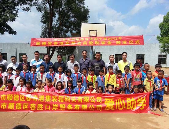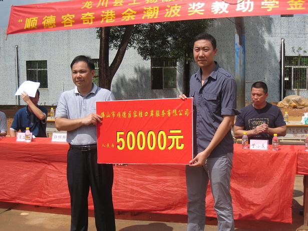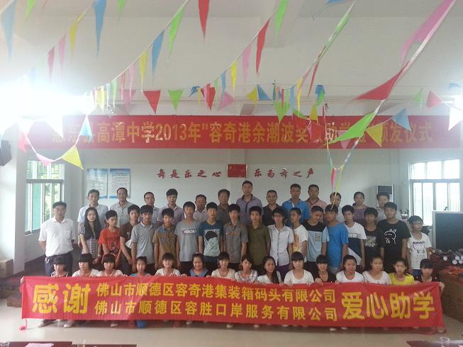 2013年6月25日、26日,公司十名员工代表与省教育基金会许副秘书长等人到惠州市惠东县“高谭中学”和河源市龙川县“上扬顺德容奇港小学”颁发2013学年“容奇港余潮波奖教助学金”,代表公司全体员工向受表彰的老师们、同学们表示衷心的祝贺,向受资助的同学表示深切的慰问。