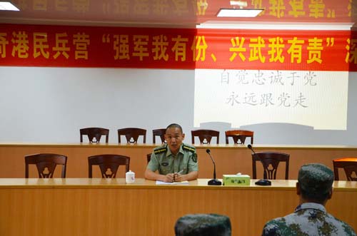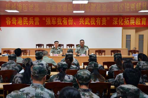 佛山军分区政治部黄卿扎副主任讲话指出,本次深化拓展教育是民兵预备役政治工作的重要内容,要求以全面贯彻党的十八大和十八届三中全会精神为指导,以习主席系列重要讲话精神为根本遵循,以战斗力建设为准绳,牢固树立能打仗、打胜仗战斗力标准,紧密结合本次民兵应急分队大比武竞赛活动,积极投身实战化训练实践,凝聚民兵预备役人员强军兴武的意志和力量。特别强调,要求容奇港民兵们充分认识本次深化拓展教育的意义,珍惜把握学习机会,通过强有力的思想政治教育,打牢思想基础,坚定政治信仰,在新形势下保证民兵预备役建设的正确方向和各项任务的圆满完成。