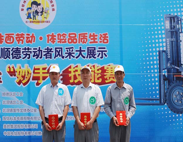 On the morning of April 24th, dong Junhua, Huang Yongbin and Gao Huan, two good forklift operators of our company, represented ronggui Trade Union to compete in the competition. They had a fierce competition with 27 employees from other 9 street towns. We saw our good forklift man, dressed neatly, energetic and absorbed, driving the forklift with ease. He drove the long needle welded on the forklift quickly and precisely through the small iron ring holding the apples, then turned around lightly and smoothly, avoiding the mineral water bottles on both sides, and transported the apples to the designated bucket. The whole process was accomplished at one go, with skillful, precise and accurate movements. As a result, Dong Junhua and Huang Yongbin won the first and second prizes respectively.