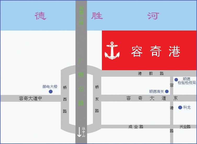 码头地处西江下游的容桂水道,位于广珠公路容奇大桥南岸东侧,距香港63海里(航程8小时),距深圳48海里(航程5个半小时),距南沙25海里(航程4个半小时),可常年停泊3000吨的船舶,地理位置优越,水陆交通枢纽畅通。